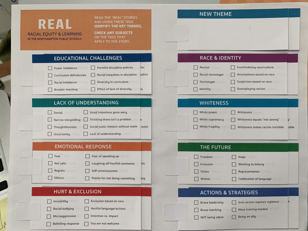 After receiving the first 30 stories, the REAL coordinating committee grouped them into broad categories, or themes. Next, students from the JFK Students of Color Alliance (SOCA) read each story, weighed in on the themes, and identified sub-themes. They submitted (and categorized) additional stories as well and had the opportunity to add their own themes.