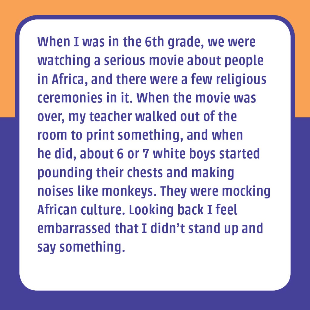 Image ID: the background of image 1 is orange (upper one-third) and purple (lower two-thirds), with a large white square with rounded corners overlaying and within that square, this story in purple font: “When I was in 6th grade we were watching a serious movie about people in Africa, and there were a few religious ceremonies in it. When the movie was over, my teacher walked out of the room to print something, and when he did, about 6 or 7 white boys started pounding their chests and making noises like monkeys. They were mocking African culture. Looking back I feel embarrassed that I didn’t stand up and say something.”
