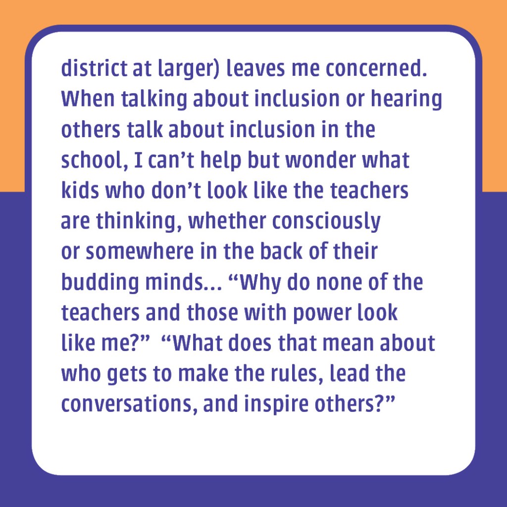 Image ID: the background of images 1 and 2 is orange (upper one-third) and purple (lower two-thirds), with a large white square with rounded corners overlaying and within that square, this text in purple: “I have been struck again and again, both in visiting my son’s school and in attending various school-level and district-level meetings and committees, at how incredibly white–at least visually–the school personnel and administrators are. For a school in which 38 percent of the children are non-white, the predominantly (or maybe exclusively?) white make-up of those who are teaching in and leading the school (and district at large) leaves me concerned. When talking about inclusion or hearing others talk about inclusion in the school, I can’t help but wonder what kids who don’t look like the teachers are thinking, whether consciously or somewhere in the back of their budding minds is, ‘Why do none of the teachers and those with power look like me?’ ‘What does that mean about who gets to make the rules, lead the conversations, and inspire others?’”