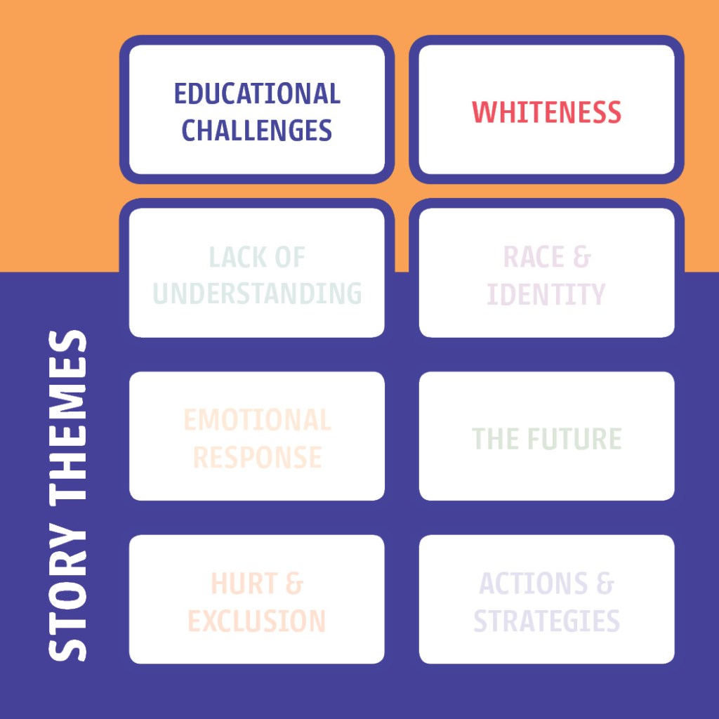 Image 3 has the same orange/purple split background, with the white text “Story Themes” running up the lower left side and two columns of white boxes (four per column) displaying our eight story themes. Here, the themes Educational Challenges and Whiteness are emphasized with bright/bold colors.