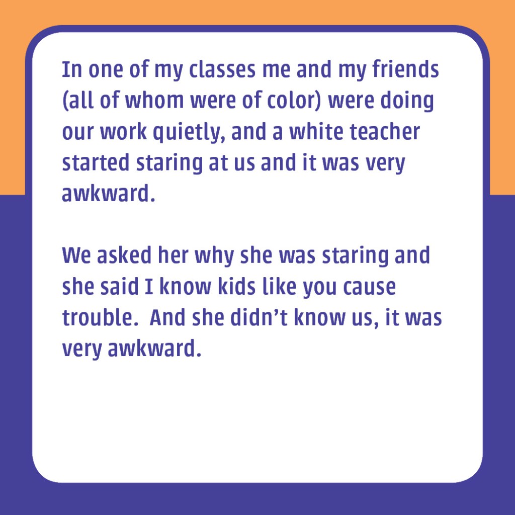 Image ID: the background of image 1 is orange (upper one-third) and purple (lower two-thirds), with a large white square with rounded corners overlaying and within that square, this text in purple: “In one of my classes me and my friends (all of whom were of color) were doing our work quietly, and a white teacher started staring at us and it was very awkward. We asked her why she was staring and she said I know kids like you cause trouble. And she didn’t know us, it was very awkward.”