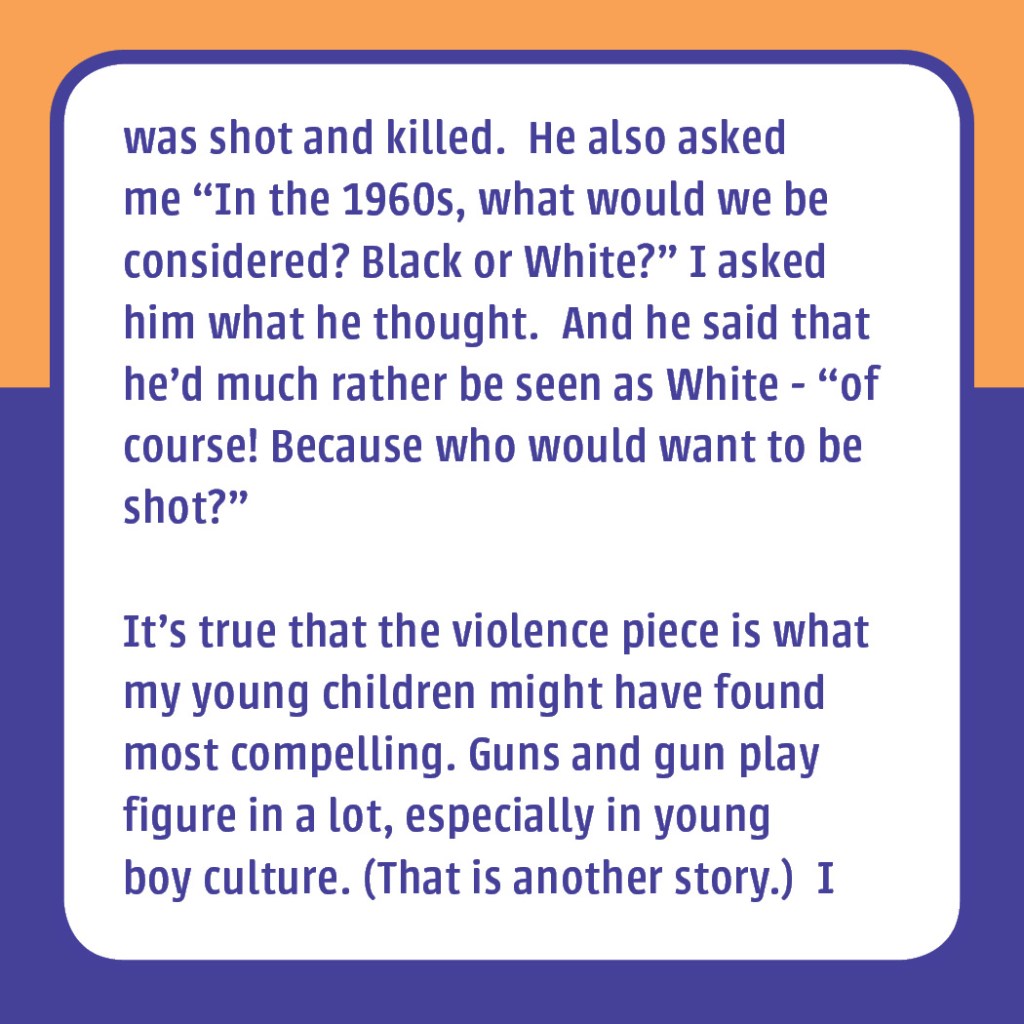 Image ID: the background of images 1-5 is orange (upper one-third) and purple (lower two-thirds), with a large white square with rounded corners overlaying and within that square, this text in purple: “I have two children in lower elementary school. I appreciate that Dr. Martin Luther King was discussed in January–this is more than what I got in elementary school. My children are mixed heritage–with one non-White parent and one White parent. After school, they were happy to chat with me about what they learned, without prompting from me. This isn’t always the case, and I was delighted by that. One of my children mentioned that they talked in school about how Dr. King was shot and killed. He also asked me, ‘In the 1960s, what would we be considered? Black or White?’ I asked him what he thought. And he said that he’d much rather be seen as White–’of course! Because who would want to be shot?’