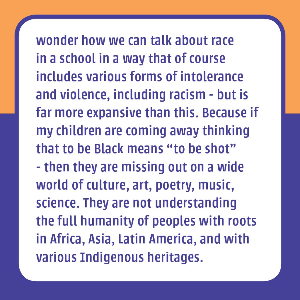 It’s true that the violence piece is what my young children might have found most compelling. Guns and gun play figure in a lot, especially in young boy culture. (That is another story.) I wonder how we can talk about race in a school in a way that of course includes various forms of intolerance and violence, including racism–but is far more expansive than this. Because if my children are coming away thinking that to be Black means ‘to be shot’–then they are missing out on a wide world of culture, art, poetry, music, science. They are not understanding the full humanity of peoples with roots in Africa, Asia, Latin America, and with various Indigenous heritages. And perhaps at school my children are missing out too on understanding a full picture of people with European heritages. Because all of these racialized identities are defined and constructed in relation to each other. That is, how can you understand what it means to be colonized without understanding colonizers and the social forces that compel any group of people to do what they do?